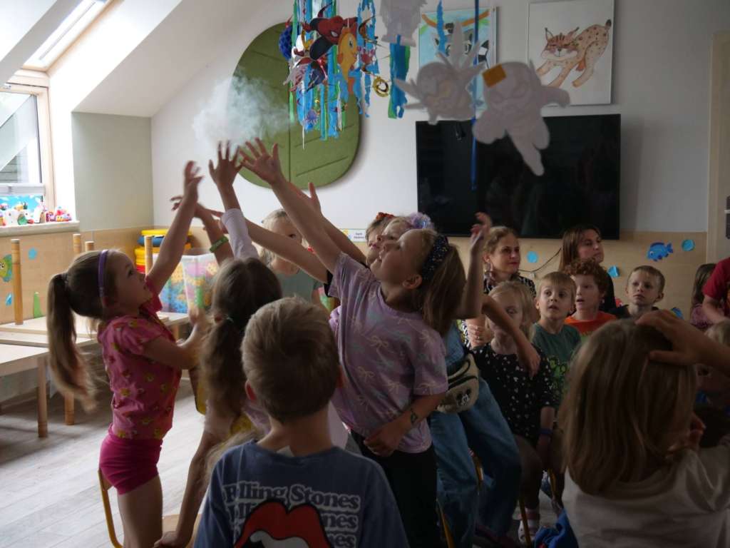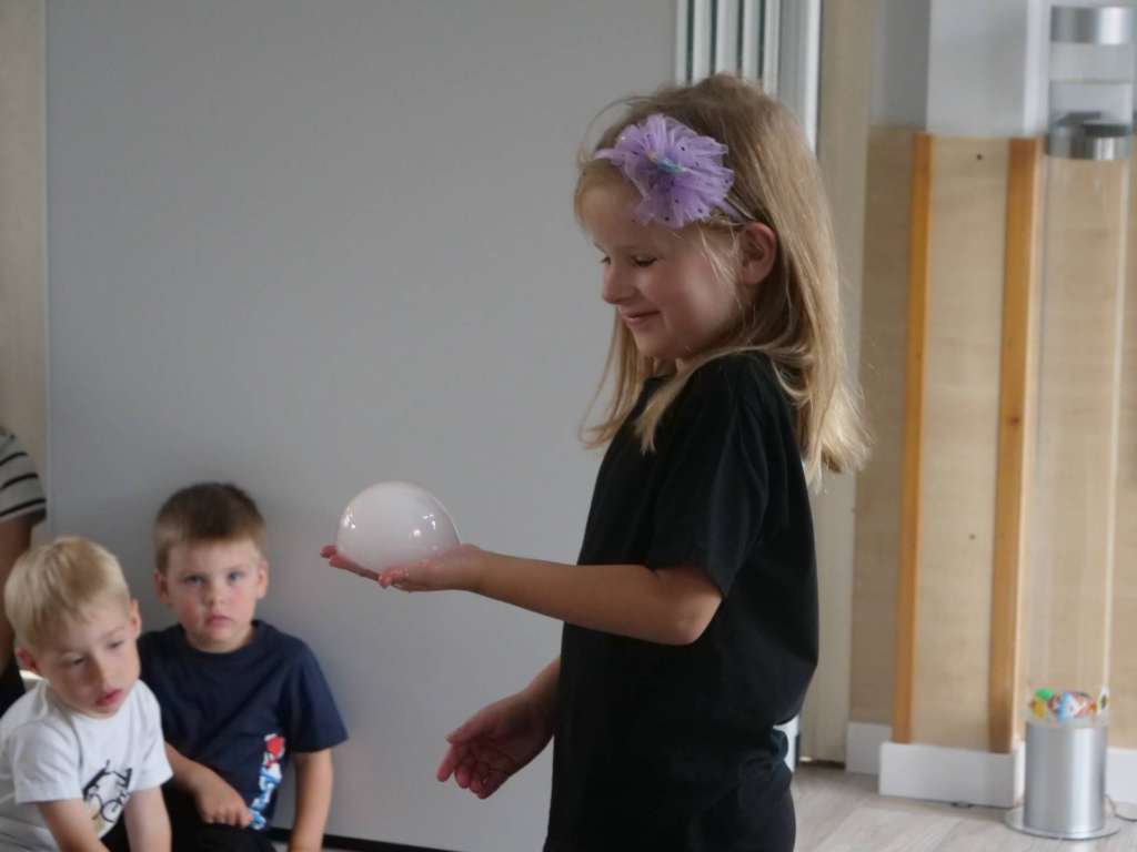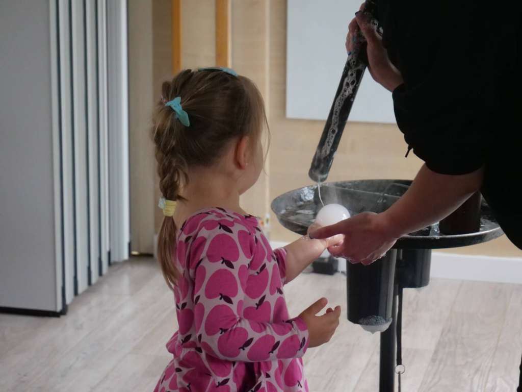 A za nami już pokaz wielkich baniek mydlanych! Dzieci były pod ogromnym wrażeniem, a najbardziej podobały im się sztuczki z ogniem. W ramach pokazu zobaczyły jeszcze: lewitujące bańki, bańki z dymem, tańczące bańki i wiele innych.